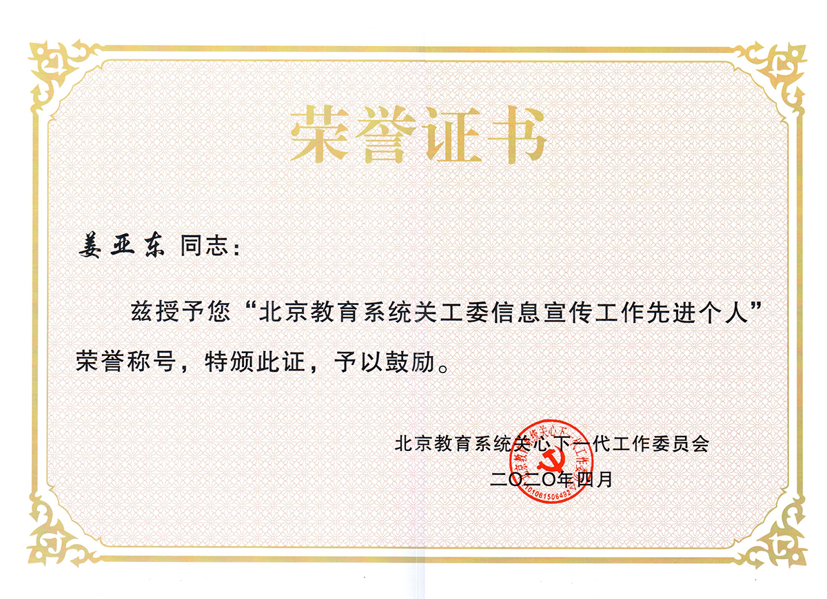 会议对2019年“读懂中国”活动、信息宣传先进单位和个人等进行了表彰。我校关工委荣获“北京教育系统关工委信息宣传先进单位”、2019年“读懂中国”活动优秀组织奖,三篇征文和两个微视频荣获“读懂中国”活动征文和微视频三等奖,姜亚东获评信息宣传工作先进个人。