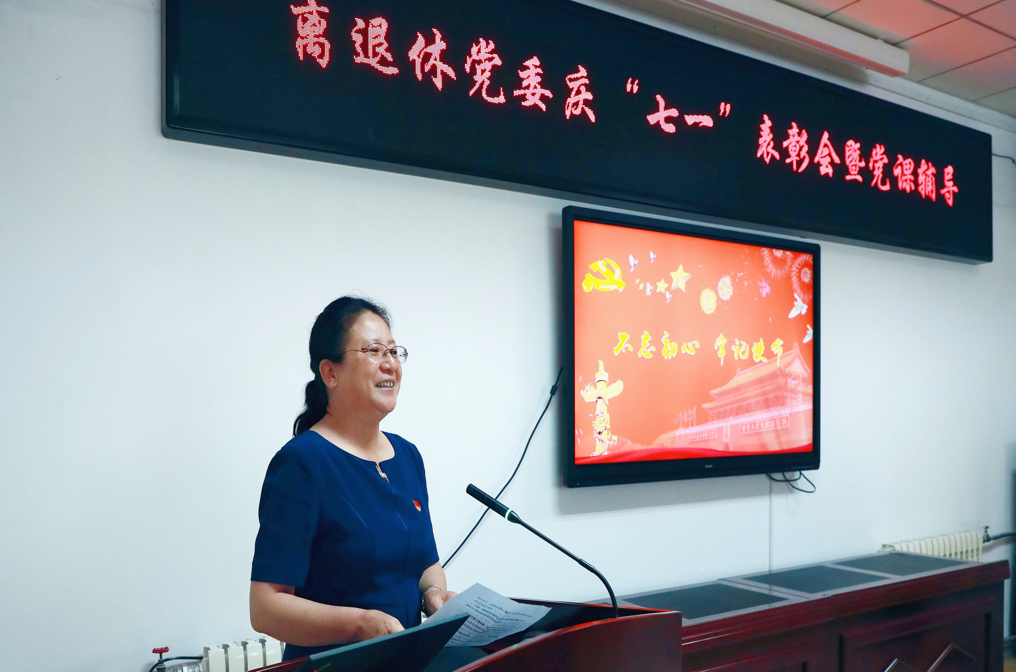田红芳同志向受到表彰的个人和集体表示祝贺,并向全体离退休党员致以节日的问候。她高度评价了离退休老同志积极向上、退休不褪色的精神风貌,希望退休老党员们不忘初心,永葆政治本色,做培育和传承优良家风的模范长辈,做宽厚包容、心态阳光的可敬长者,做“学习新思想,跟上新时代,体验新生活、做出新贡献”的时代老人,为学校建设和事业发展做出贡献。