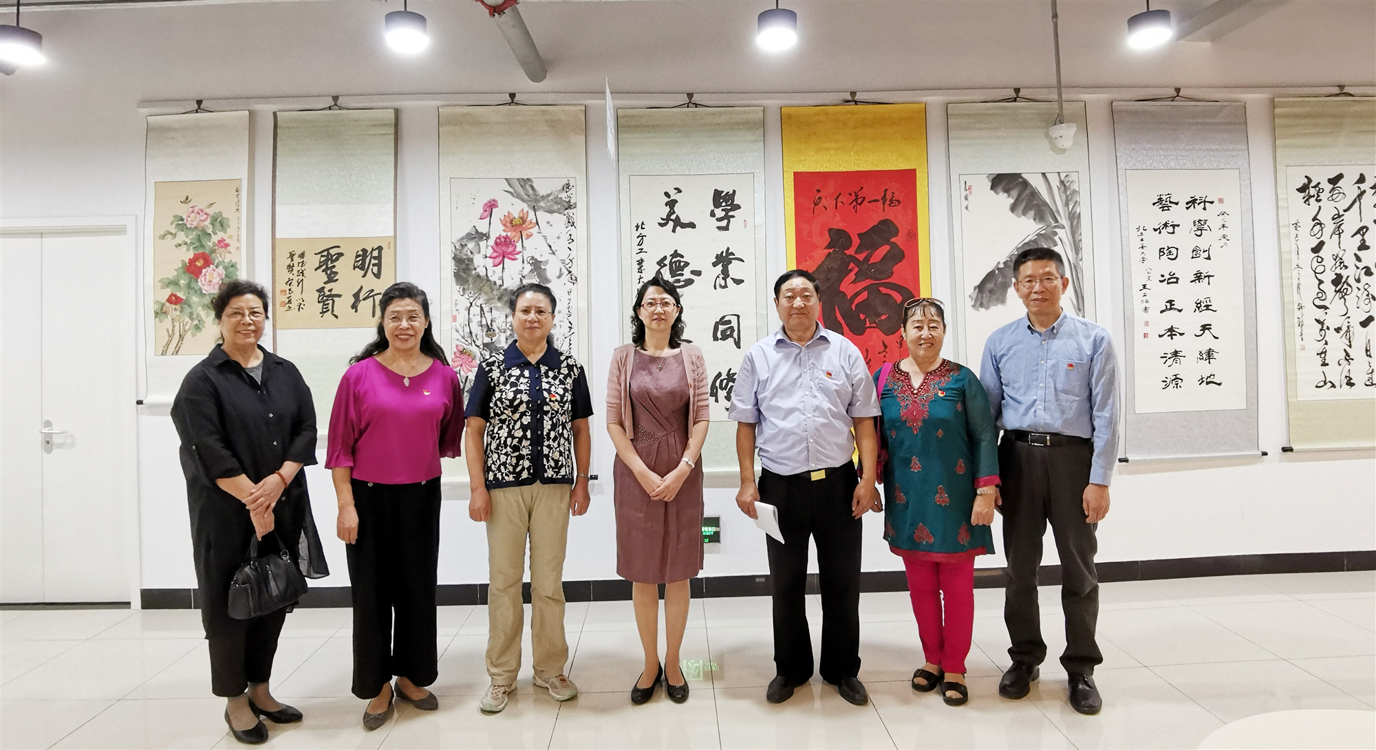 仪式结束后,与会人员参观了师生书画作品。本次书画展共征集到书画作品200余幅,经过精心挑选,最终50幅作品入选展出,参展作品既有八九十岁老师的,也有二十来岁学生的,还有来自社会艺术家的,可谓师生同乐迎国庆,老少咸集抒情怀。