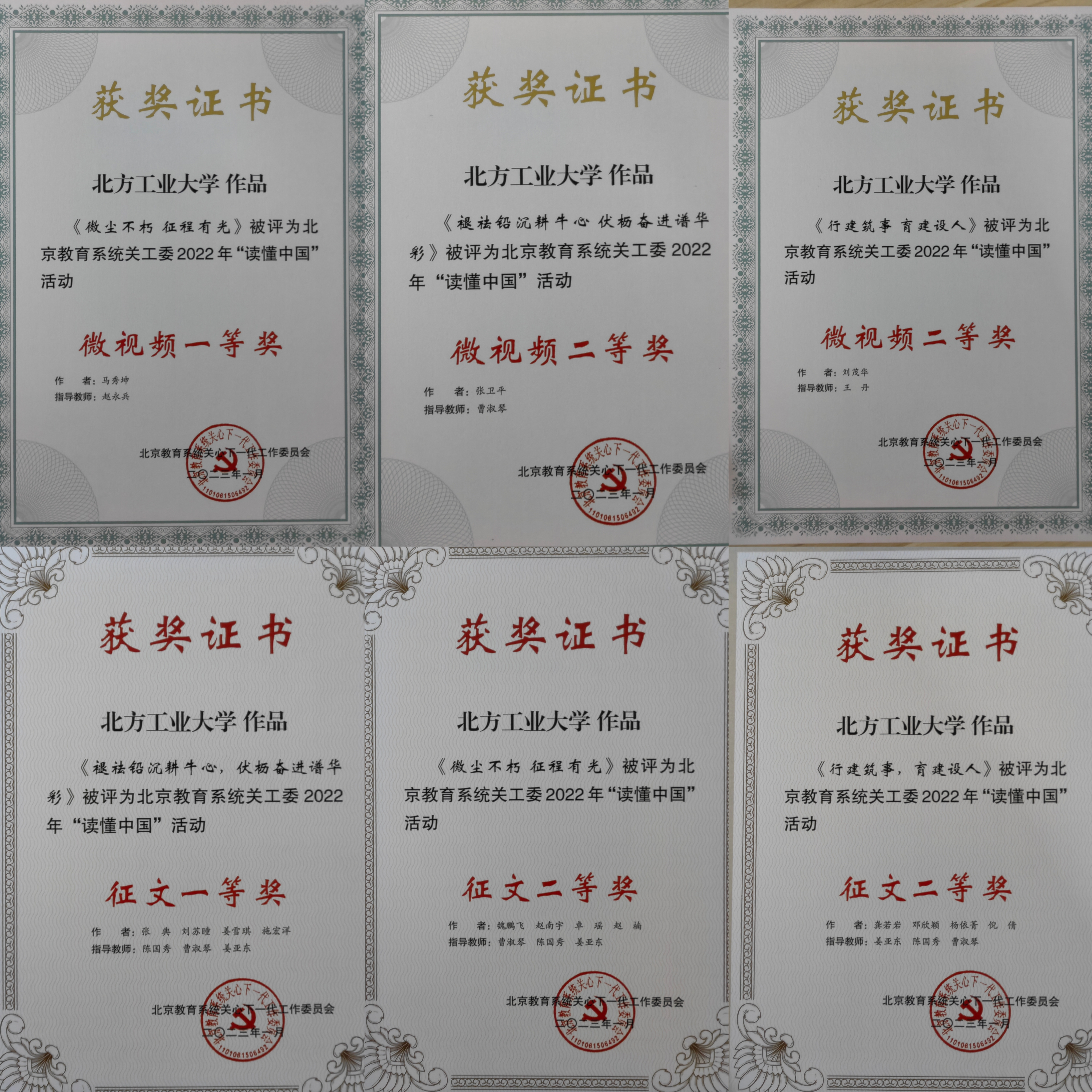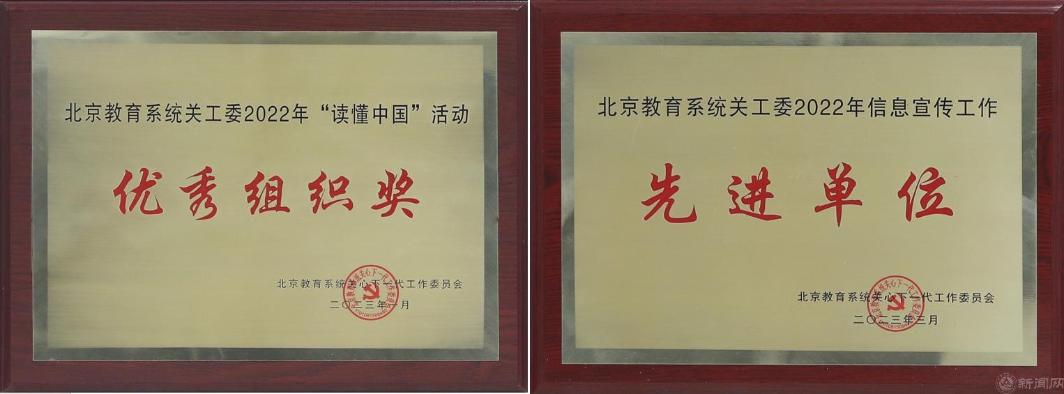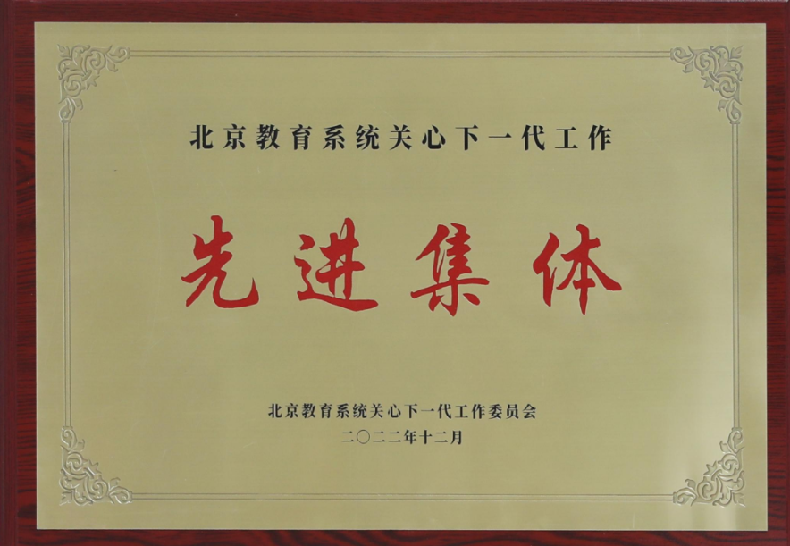 校关工委荣获“北京教育系统关心下一代工作先进集体”“北京教育系统关工委2022年信息宣传工作先进单位”“北京教育系统关工委2022年‘读懂中国’活动优秀组织奖”。校关工委常务副主任杨军、老党员先锋队队长陈太栋被评为“北京教育系统关工委先进工作者”,校关工委秘书长曹淑琴被评为“北京教育系统关工委信息宣传工作先进个人”。我校“读懂中国”活动微视频作品荣获北京教育系统关工委一等奖1项、二等奖2项,征文荣获一等奖1篇、二等奖2篇。
