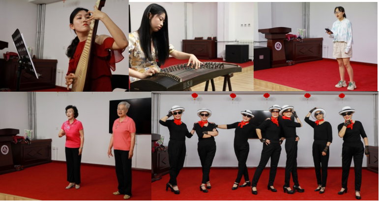 参加歌会的老同志们精神饱满、神采奕奕,青年学子积极阳光、朝气蓬勃,他们携手同台、联袂表演,合唱《我和我的祖国》《这世界那么多人》,独唱《同一首歌》、京剧《红梅赞》,古筝独奏《战台风》、琵琶独奏《草原小姐妹》、模特走秀《走向美好未来》等节目精彩纷呈。师生们用一首首感情充沛的曲目、一段段催人奋进的旋律,深情地表达对党和祖国的真挚热爱。正式演出前,老同志歌唱队进行反复多遍认真的排练,用敬业的态度和执着的行动教育着青年学生,潜移默化地把爱党爱国的情感浸润进现场每个人的心田。