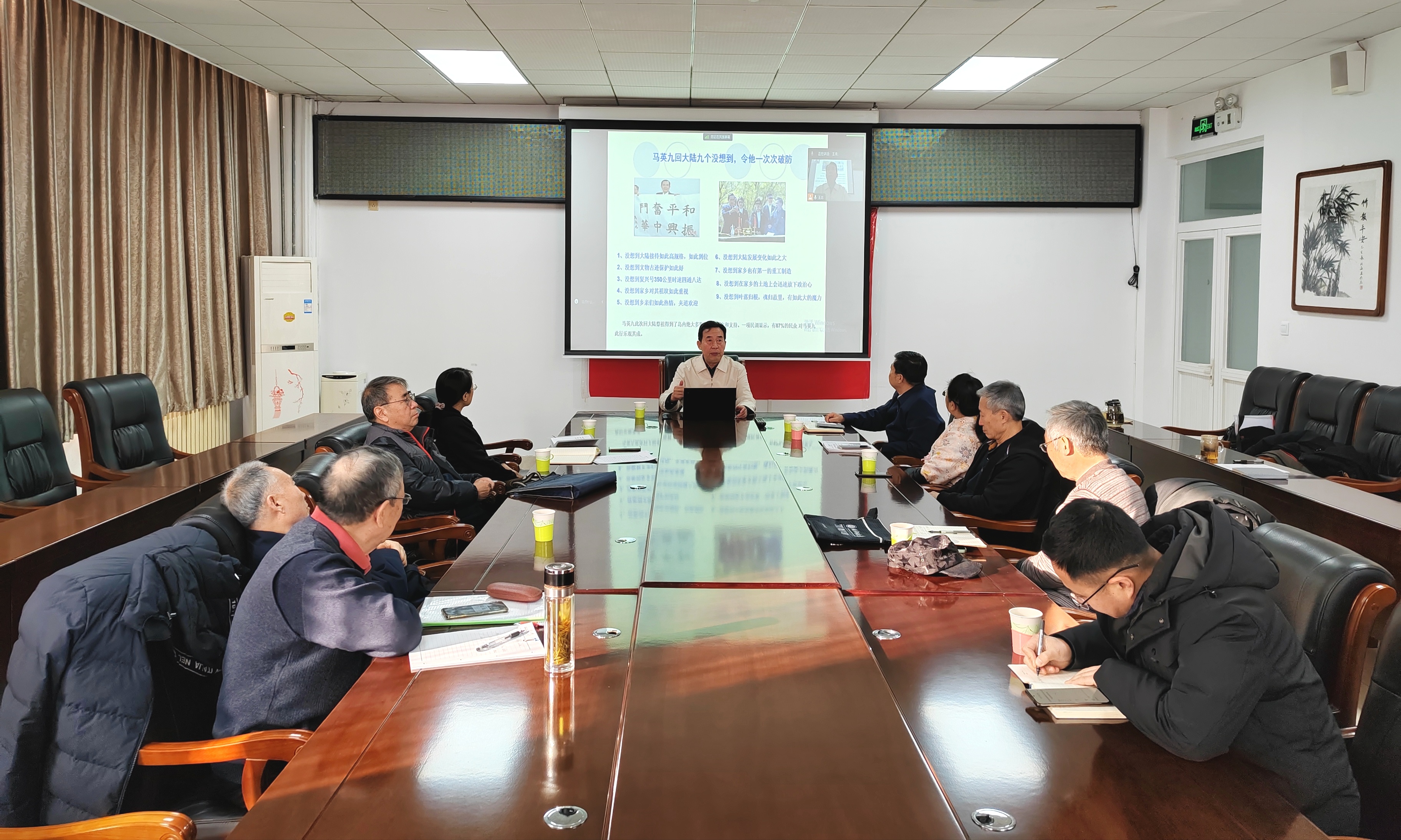 为了使离退休老同志更深入地了解国家的形势与政策,12月18日上午,永利集团yl6809官网委员王包泉同志作了题为《坚持贯彻新时代党解决台湾问题的总体方略》的报告。报告通过腾讯会议,采取线上线下相结合的方式举行,永利集团yl6809官网委员、第一退休教职工党支部部分党员及全体在职党员在现场参加学习,其他离退休党员在线上参加了报告会。