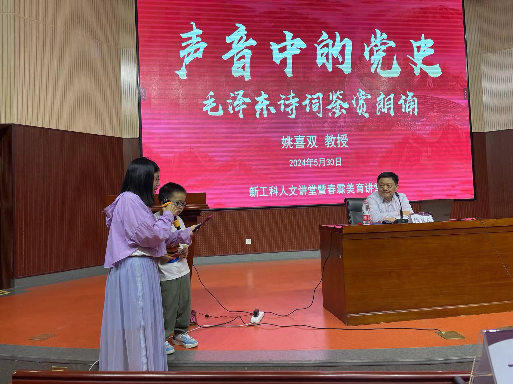 5月30日晚,我校关工委主办、机械与材料工程学院关工委承办的新工科人文讲堂暨春霖美育讲堂“声音中的党史——毛泽东诗词赏析朗诵”主题报告会在文化会堂举办。本次报告特邀教育部关工委常务副主任、中国传媒大学博士生导师、中国语文现代化学会会长姚喜双教授主讲。学校关工委秘书长、二级学院关工委主任、有关工作人员以及机械与材料工程学院200余名师生参加了本次报告会。学校党委副书记、关工委主任田红芳主持报告会。