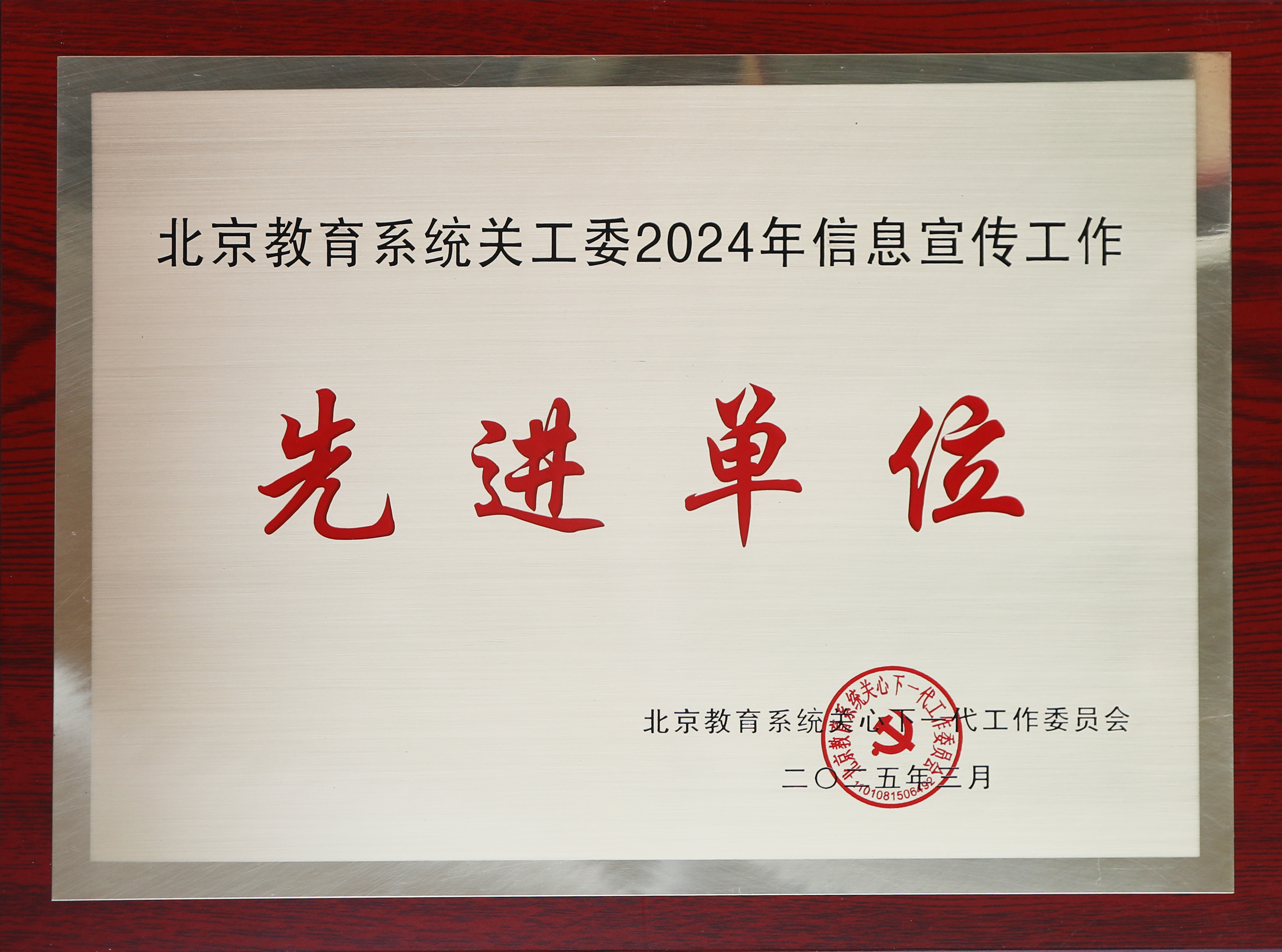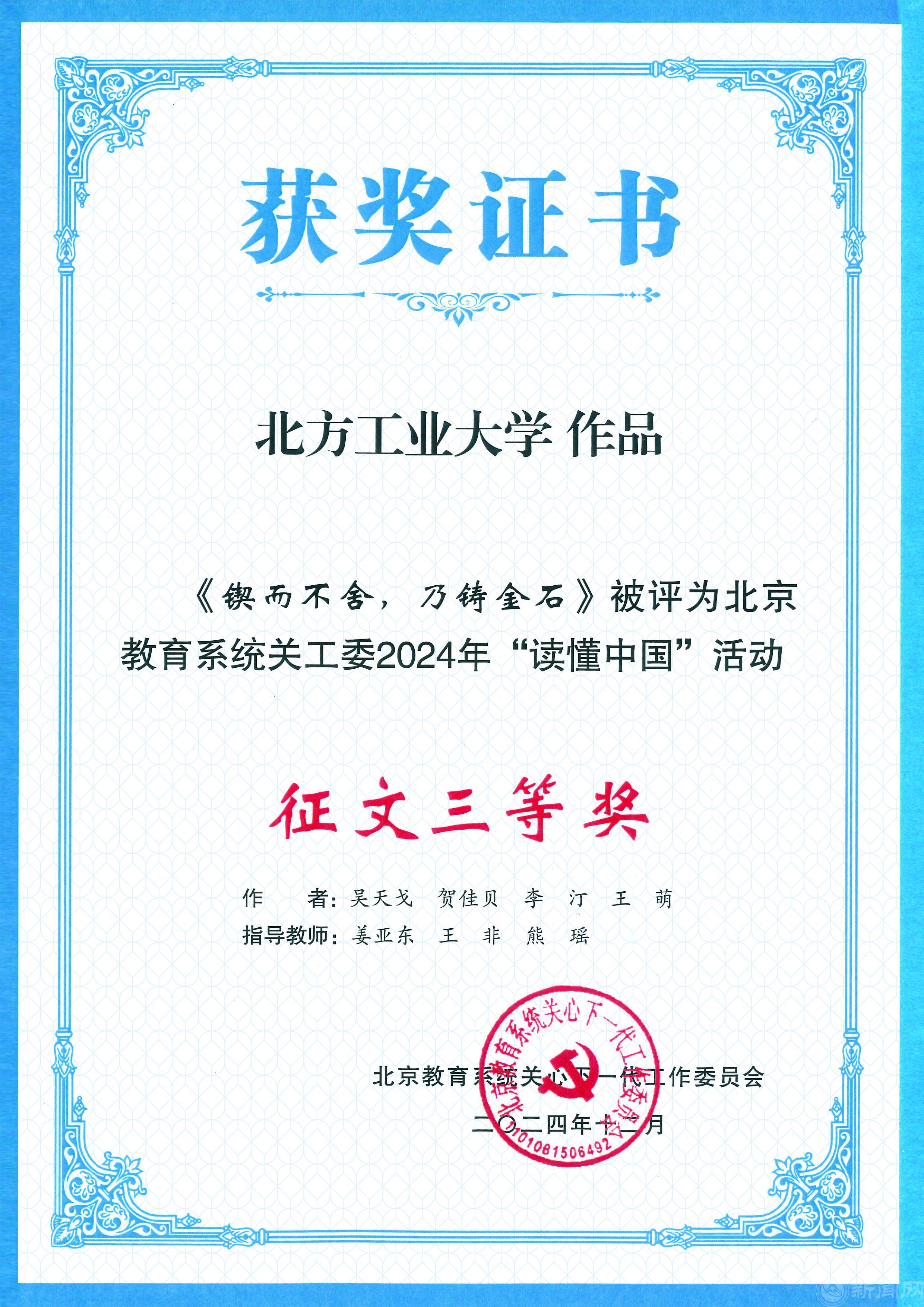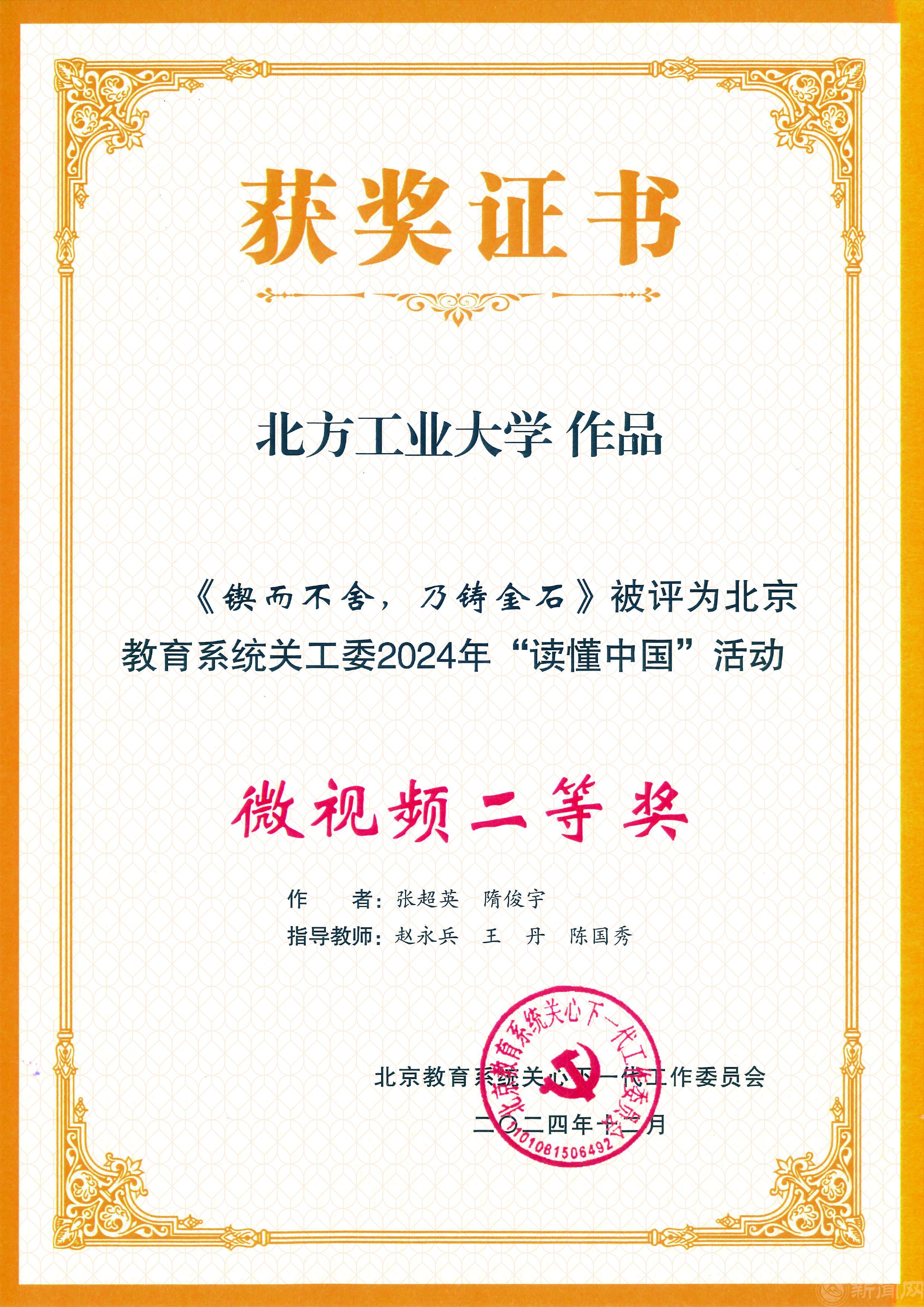 我校关工委荣获“北京教育系统关工委2024年信息宣传工作先进单位”“北京教育系统关工委2024年‘读懂中国’活动优秀组织奖”“北京教育系统2024年军训服装捐赠工作先进单位”。校关工委隋俊宇被评为“北京教育系统关工委信息宣传工作先进个人”。我校“读懂中国”活动微视频作品荣获北京教育系统关工委二等奖1项,征文荣获三等奖1篇。